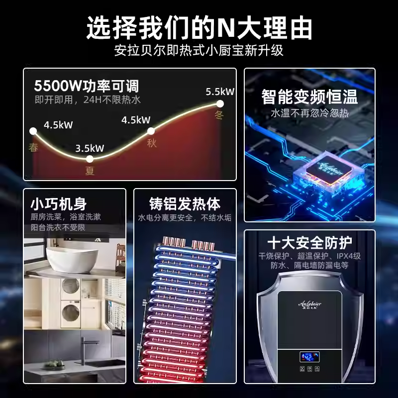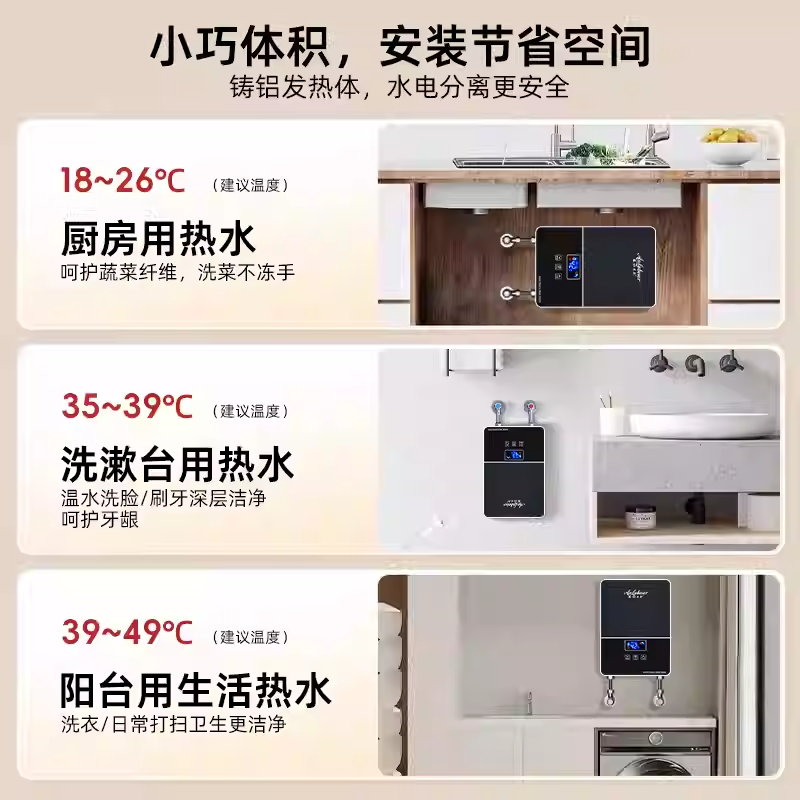 首先,这是一款小身材,大能量的小厨宝! 你看,它就跟一张A4纸差不多大,还能任意角度安装,特别省空间。不管是装在厨房水槽下,还是浴室洗手盆旁,都完全不碍事。不用打孔,安装超省心,租房也能享受即热热水!