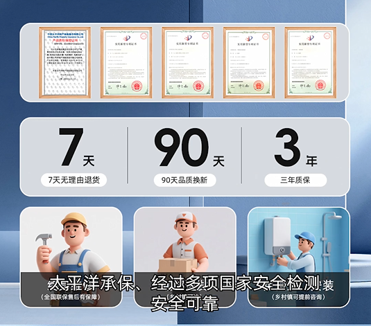 5、太平洋承保、经过多项国家安全检测,安全可靠。7天无理由退货、90天品质换新、3年超长质保、终身维修,让你买的放心,用的安心。
