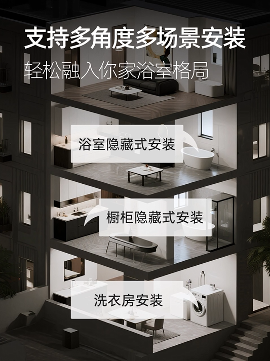 关键就在于它的“至薄设计”——整机厚度只有大约4.5厘米,大小和一本杂志差不多,装在浴室毫不突兀,小巧又不失大气。再加上它支持多角度灵活安装,无论是新房装修还是老房改造,都能轻松融入你家浴室格局。