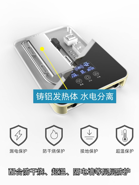 更安心的是,它内置铸铝发热体,实现“水电分离”,配合防干烧、超温、隔电墙等层层防护,就像为沐浴上了多道安全锁。