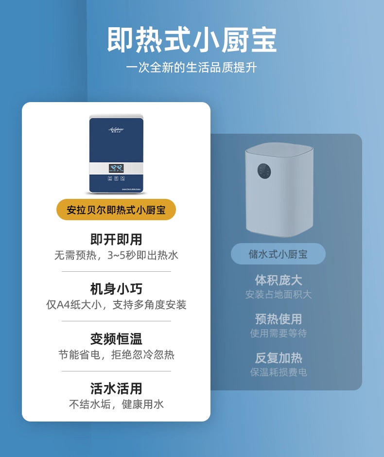 首先,这是一款小身材,大能量的小厨宝! 你看,它就跟一张A4纸差不多大,还能任意角度安装,特别省空间。不管是装在厨房水槽下,还是浴室洗手盆旁,都完全不碍事。不用打孔,安装超省心,租房也能享受即热热水!