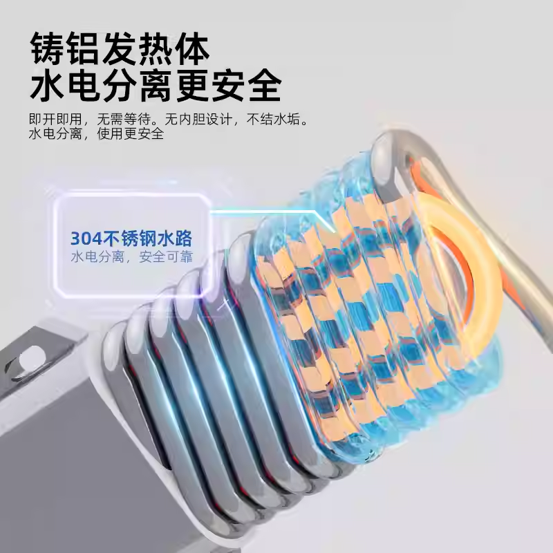 水电分离技术:大部分即热式电热水器都采用了水电分离的设计,加热管与水隔离开来,电流不会接触到水。