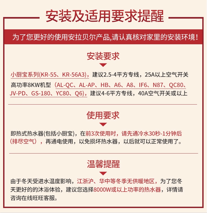 功率大,需独立布线:必须使用 4-6平方毫米甚至更粗的专用铜芯电线,并从家庭配电箱单独引出一路,安装独立的、与功率匹配的漏电保护空气开关。老旧房子的电路可能无法满足。
