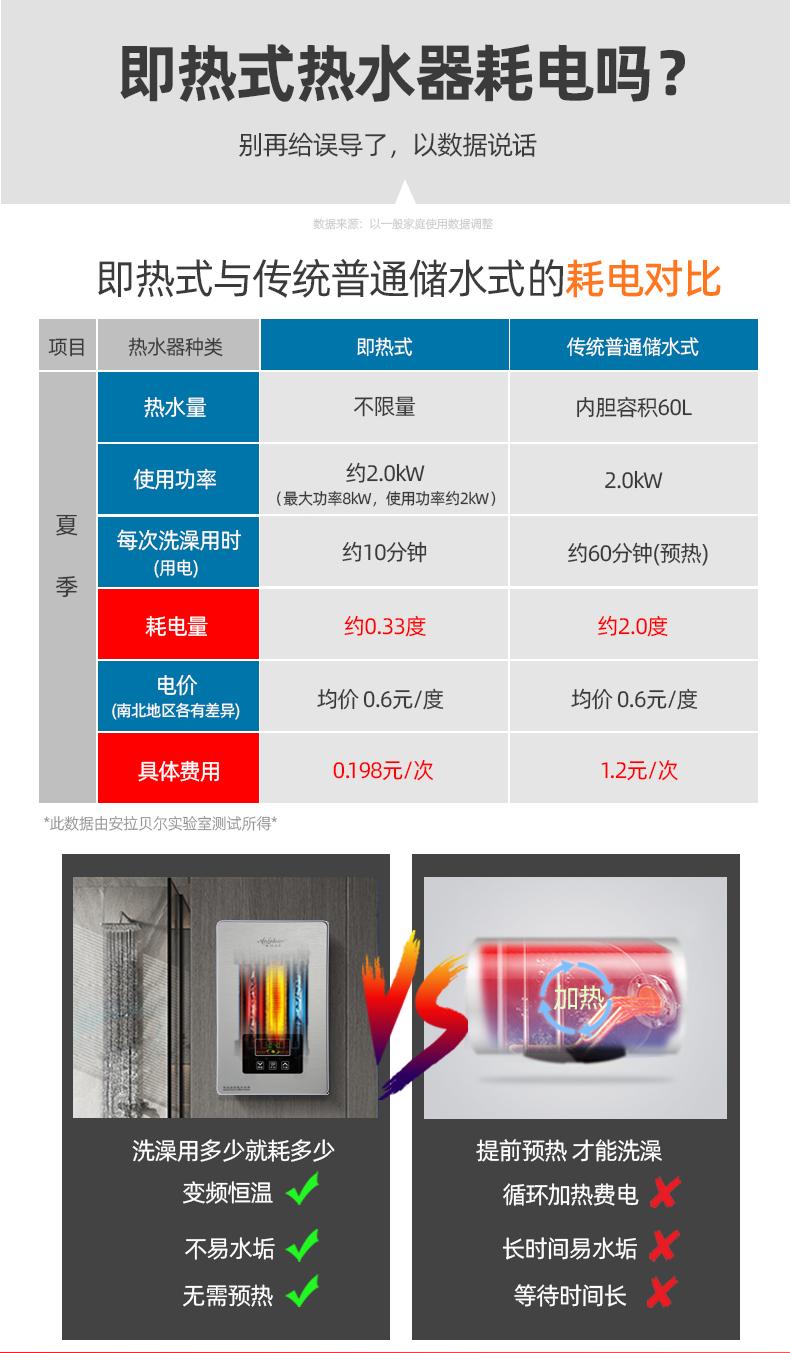 简单来说,即热式电热水器之所以省电,是因为它避免了传统储水式热水器在等待加热和保温过程中产生的能量浪费,做到了“用多少水,烧多少水,即用即烧”。