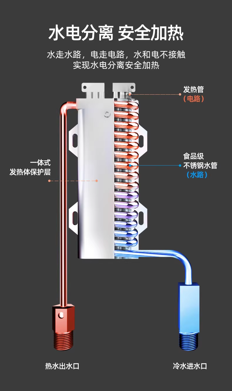 多层级绝缘:发热丝被高绝缘性能的氧化镁粉严密包裹,外面再套上金属管,最后整体压铸在铝体内。水流经的是专门设计的水道(通常由铝体或非金属材质构成),与带电的发热丝之间隔着多层绝缘物质。